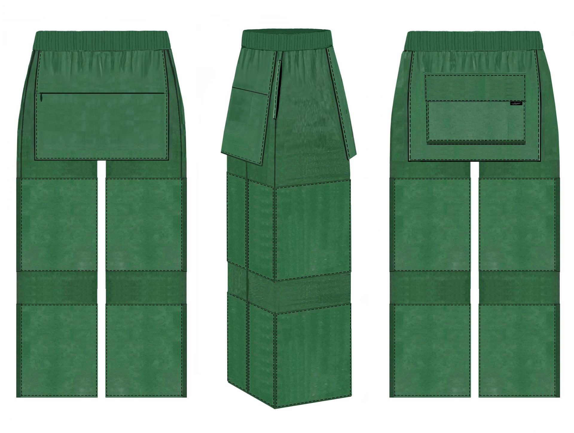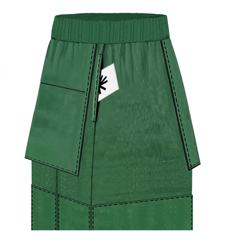 Different styles of pockets to the front top corners of pants, the front and back flaps