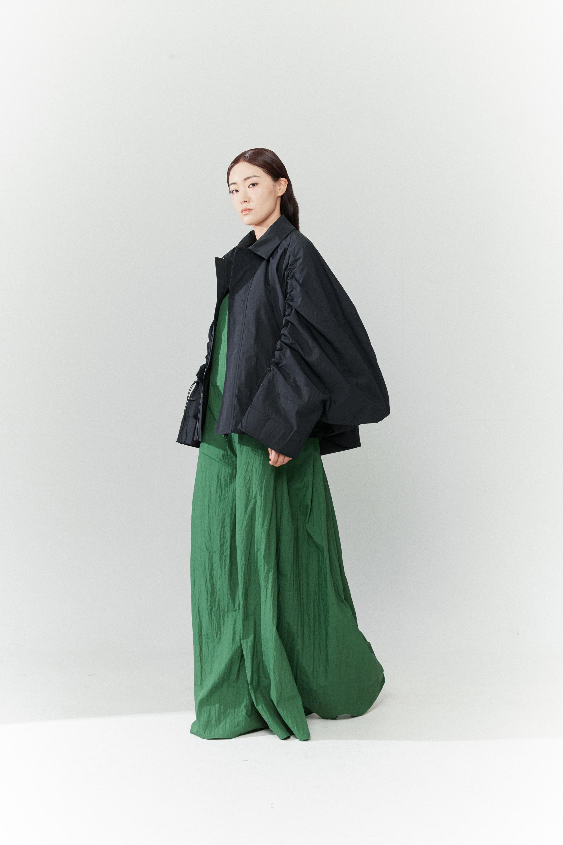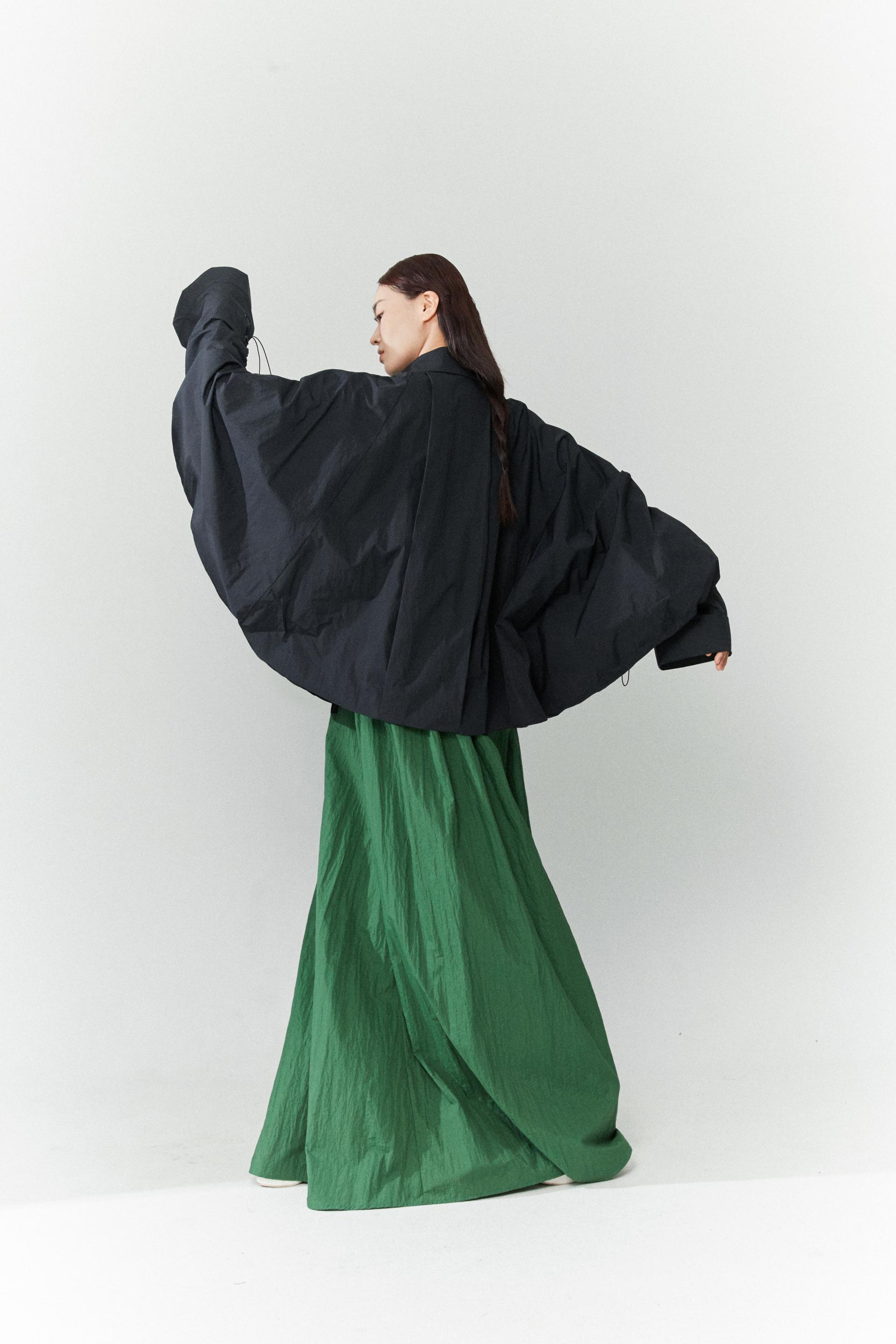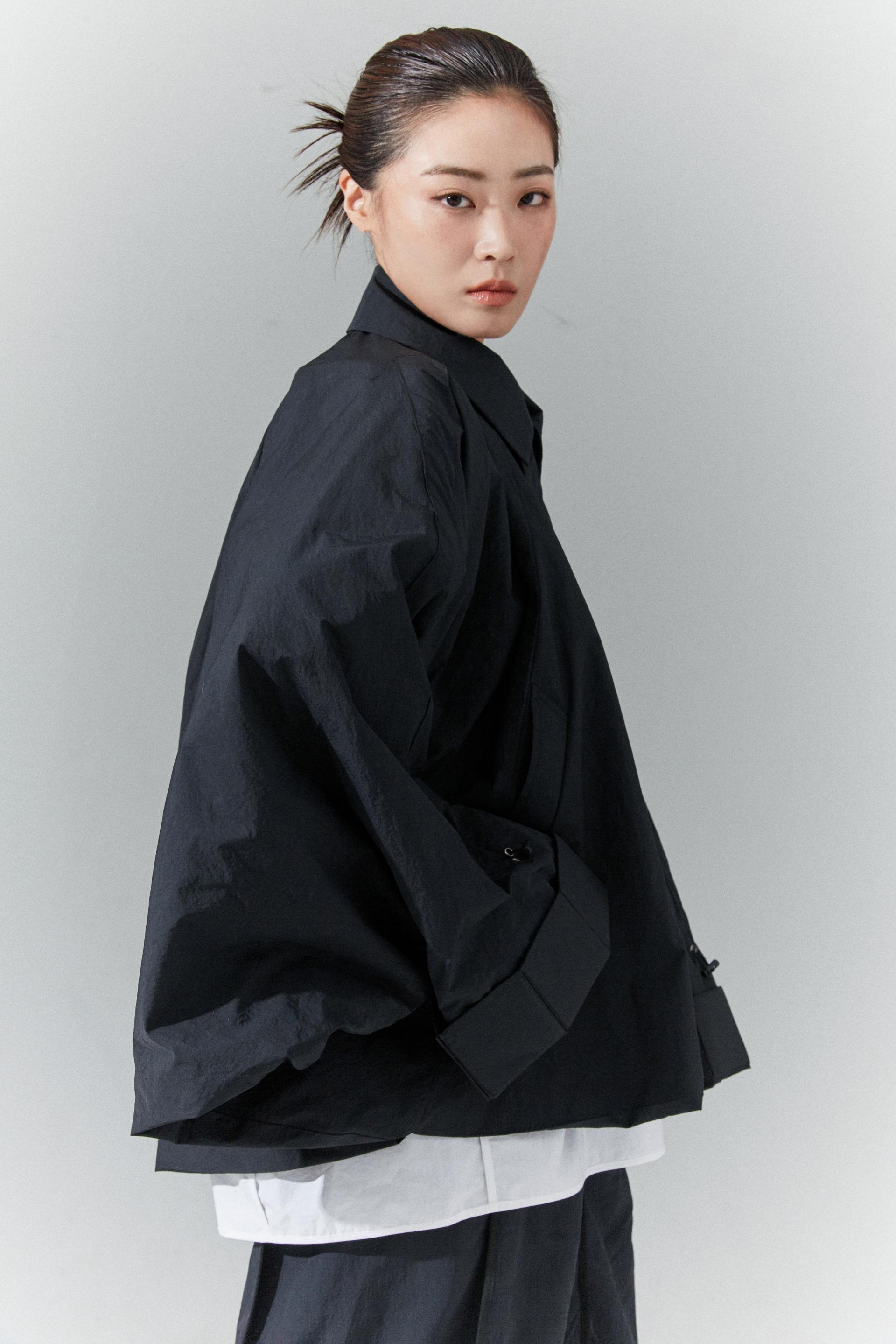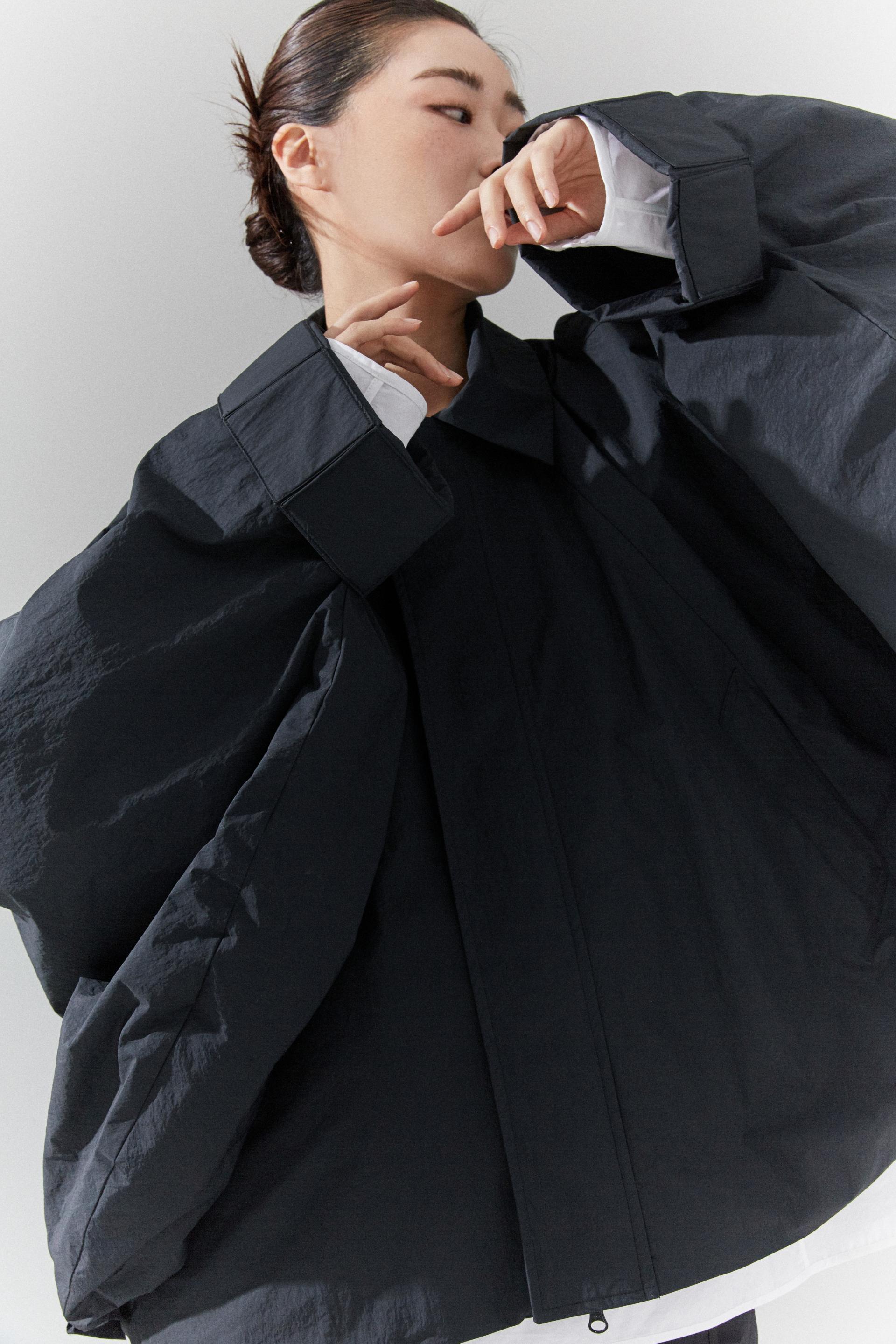 An oversized cropped jacket with a semi-circular silhouette for intermediate weather