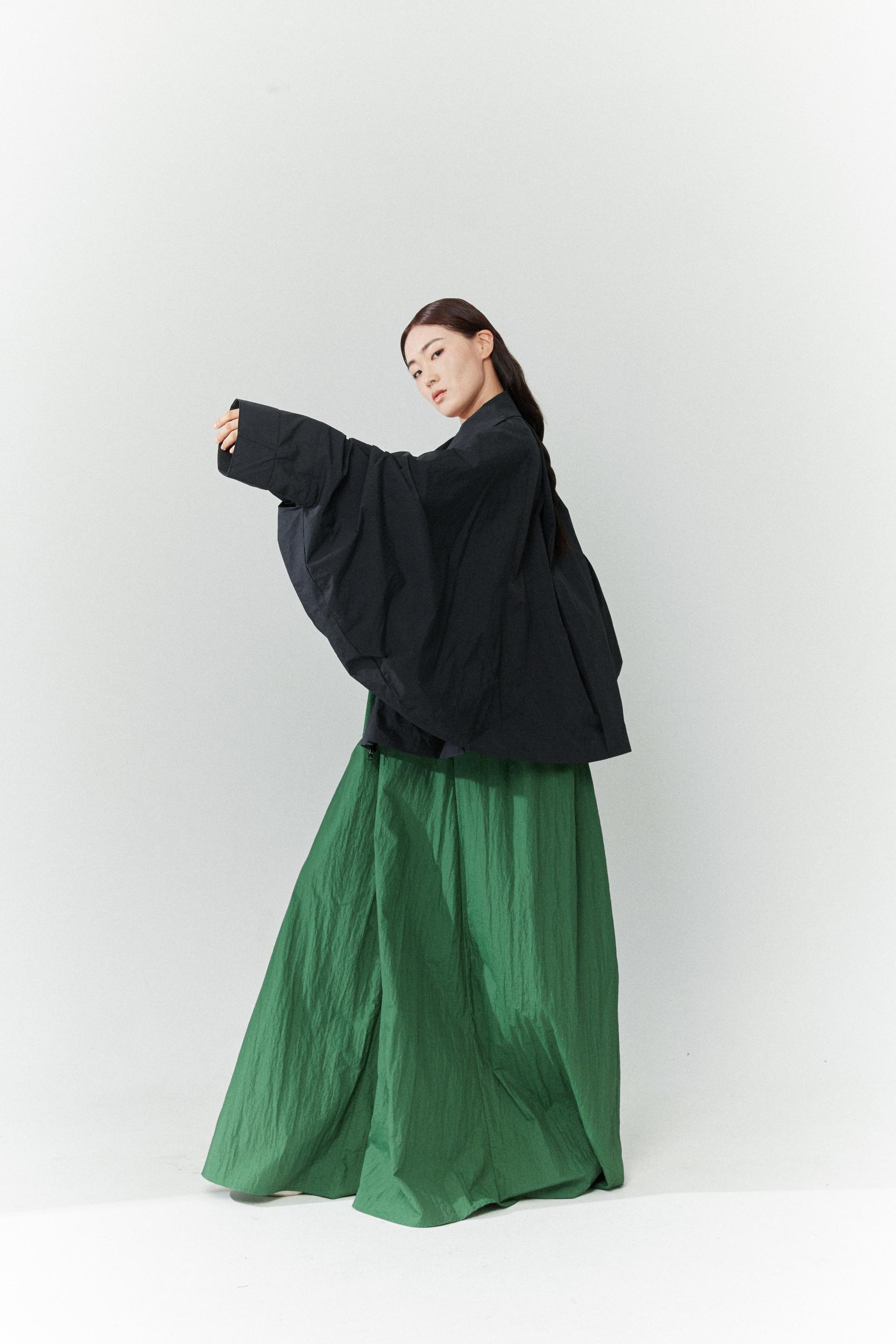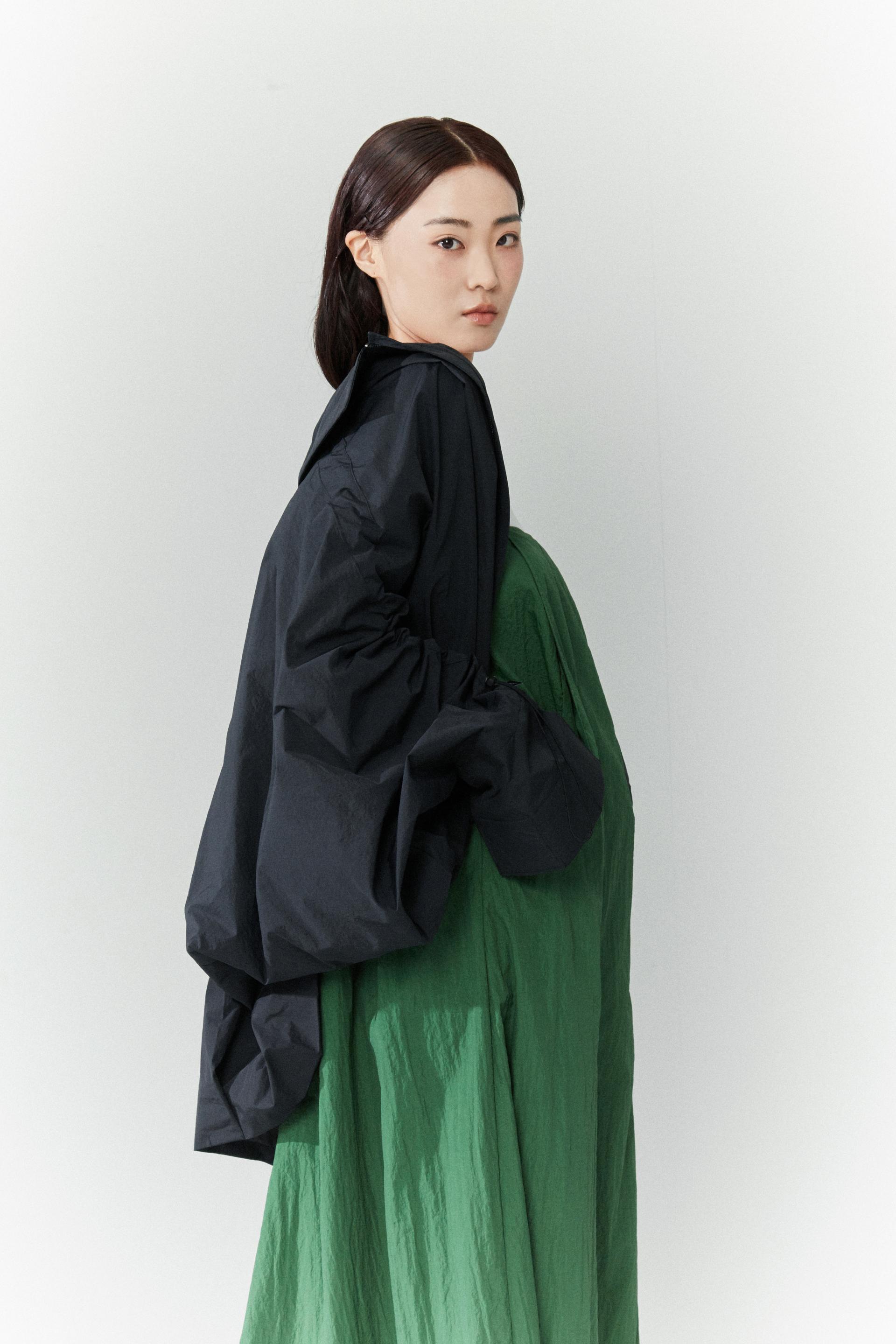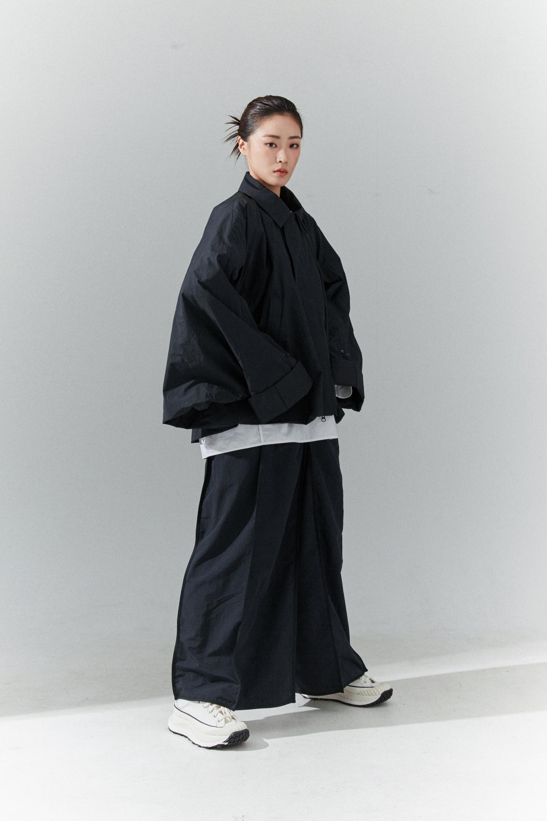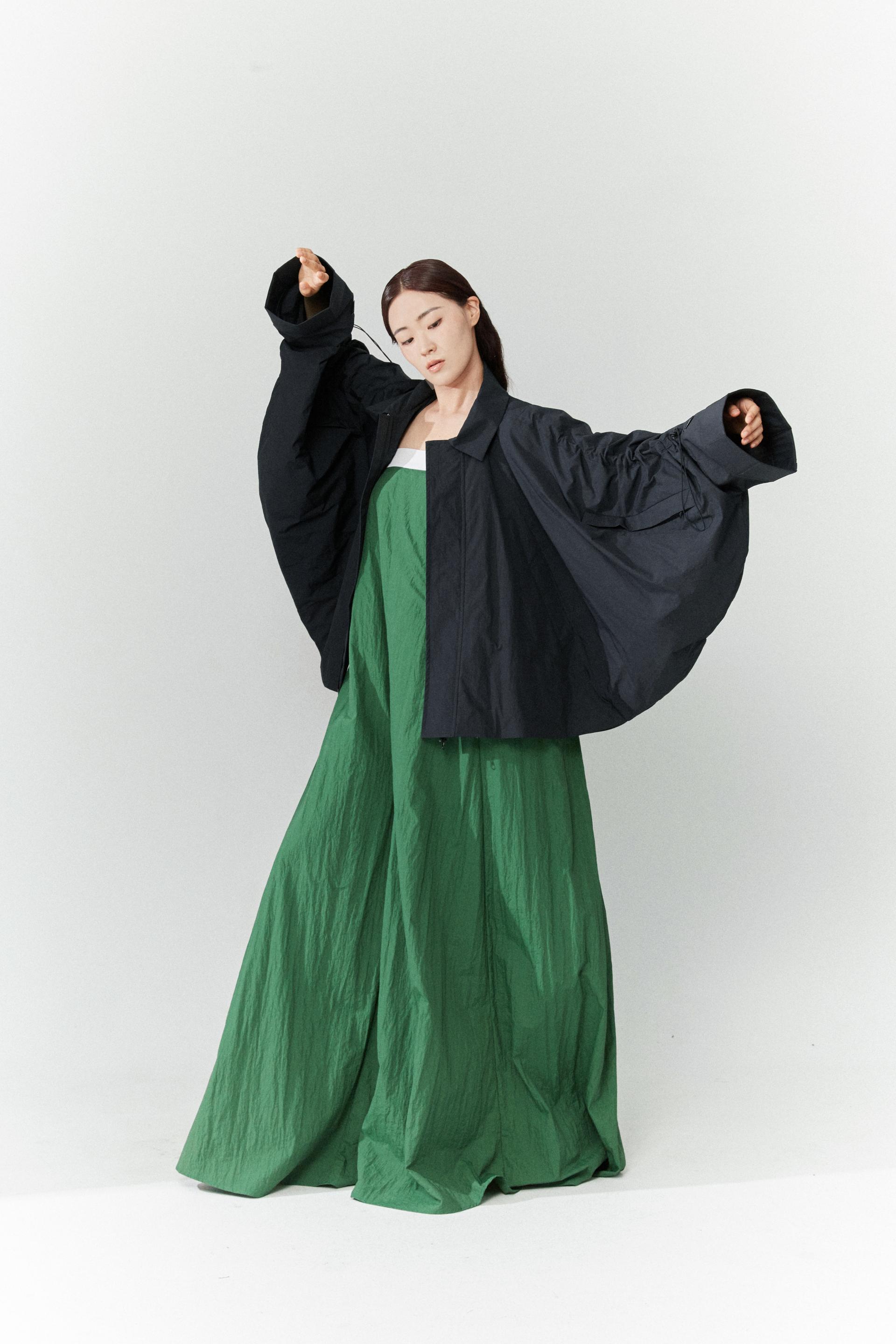 An oversized cropped jacket with a semi-circular silhouette for intermediate weather
