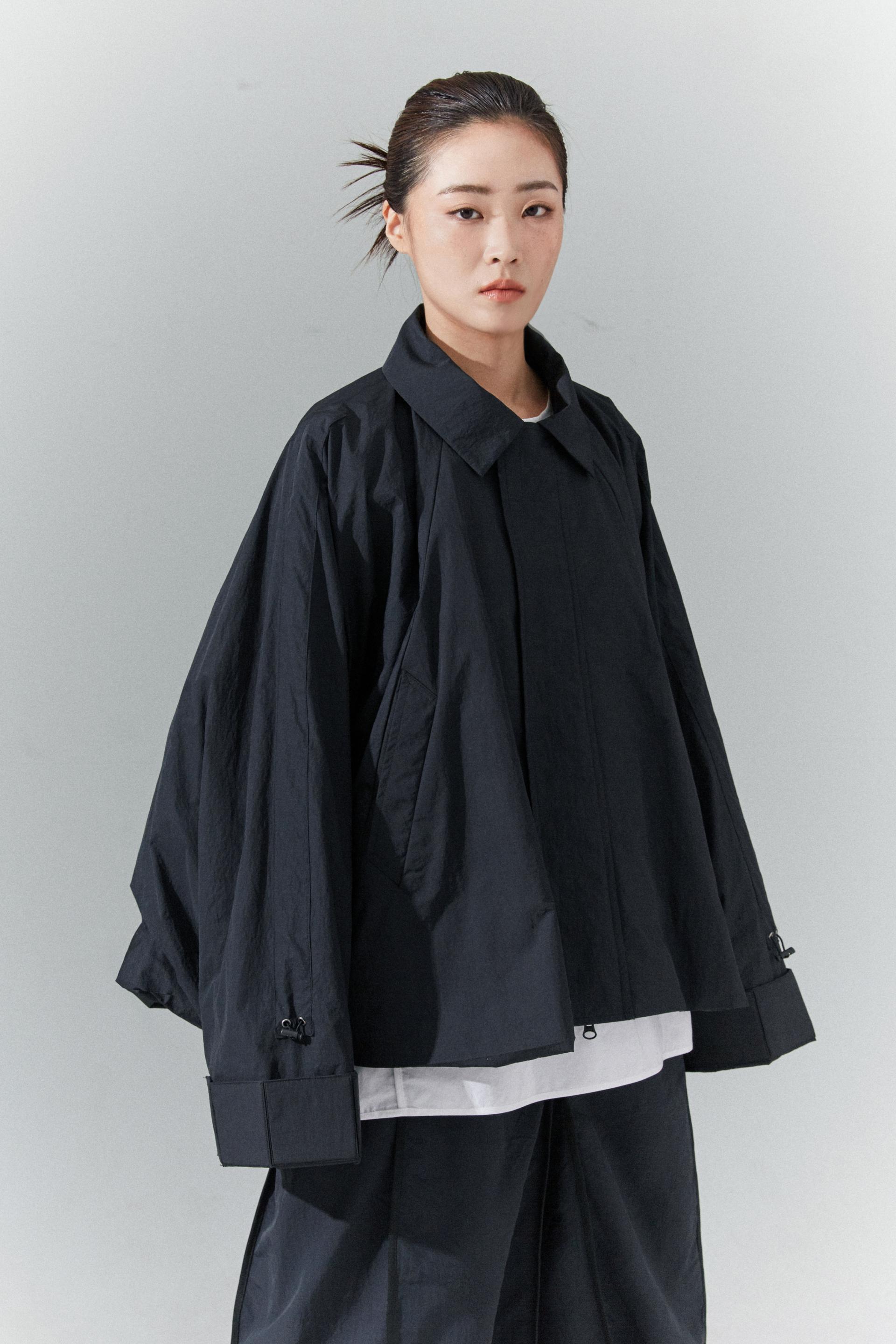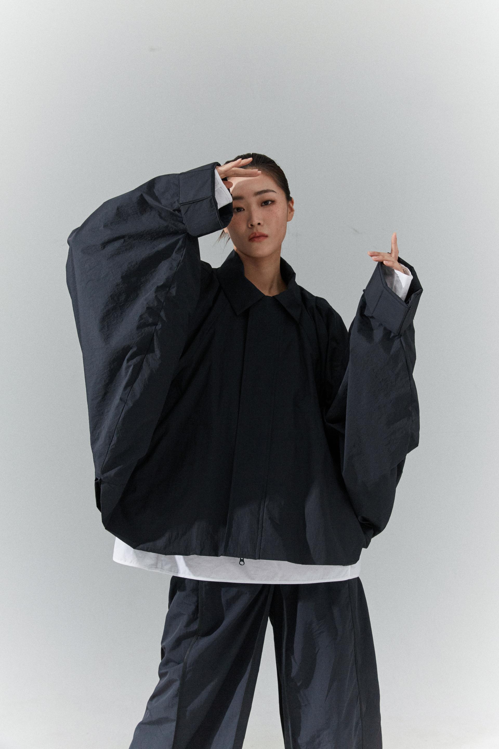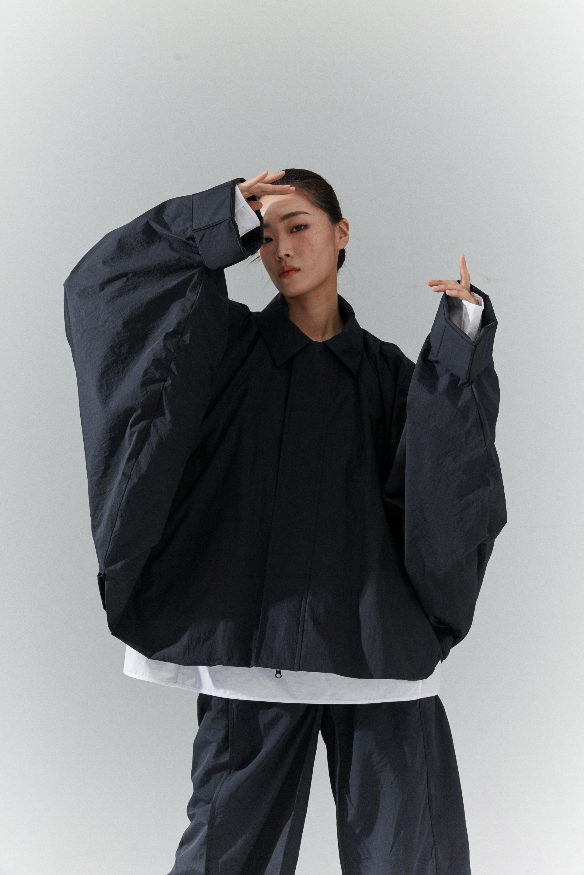 Two-way zipper on the front, pocket details on wide sleeves and body panels