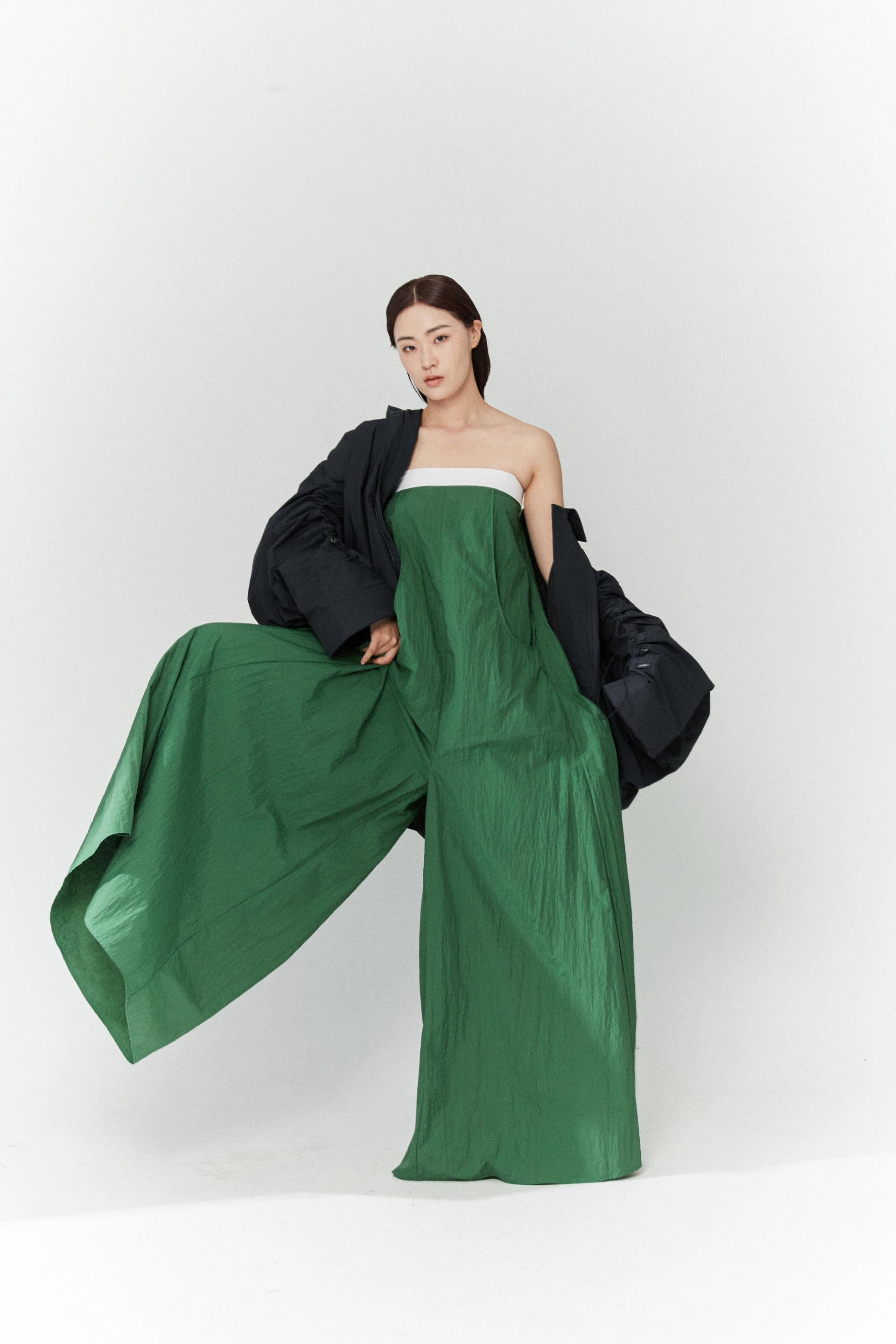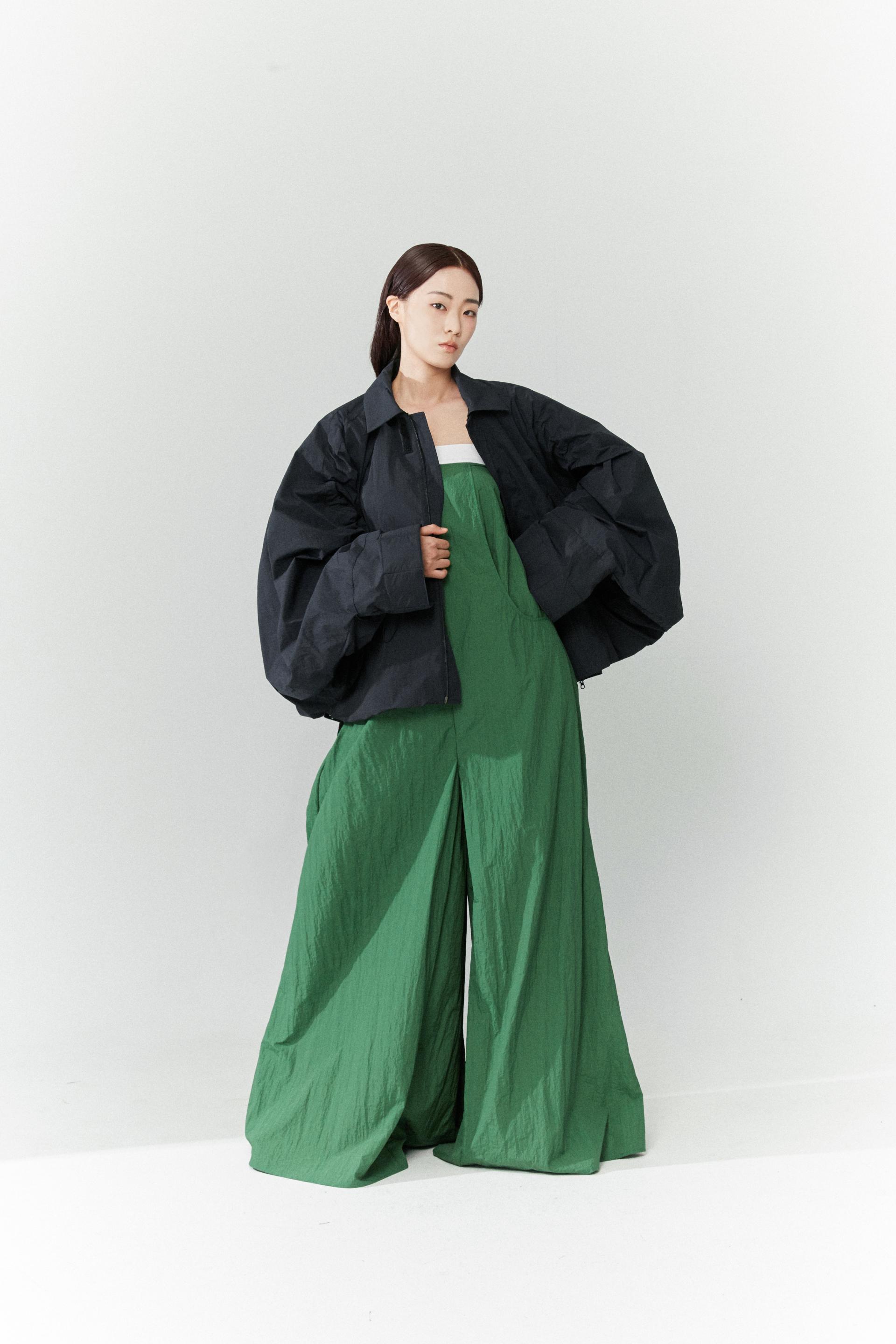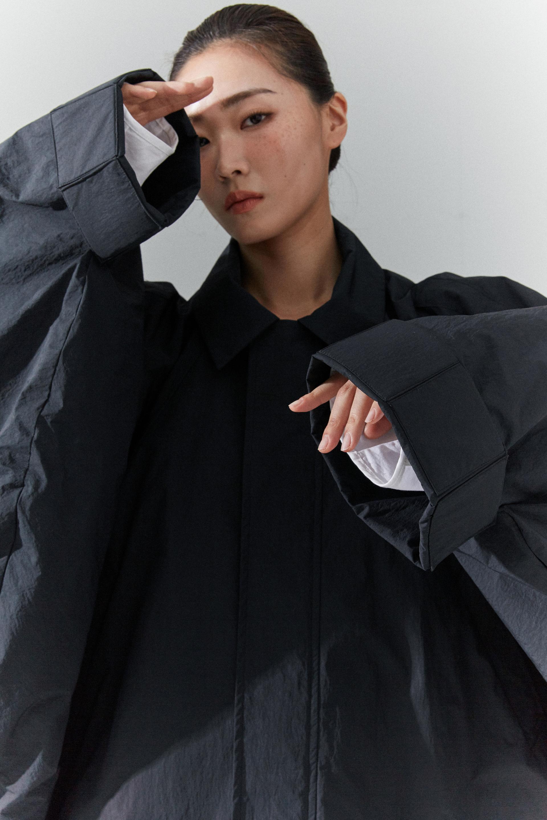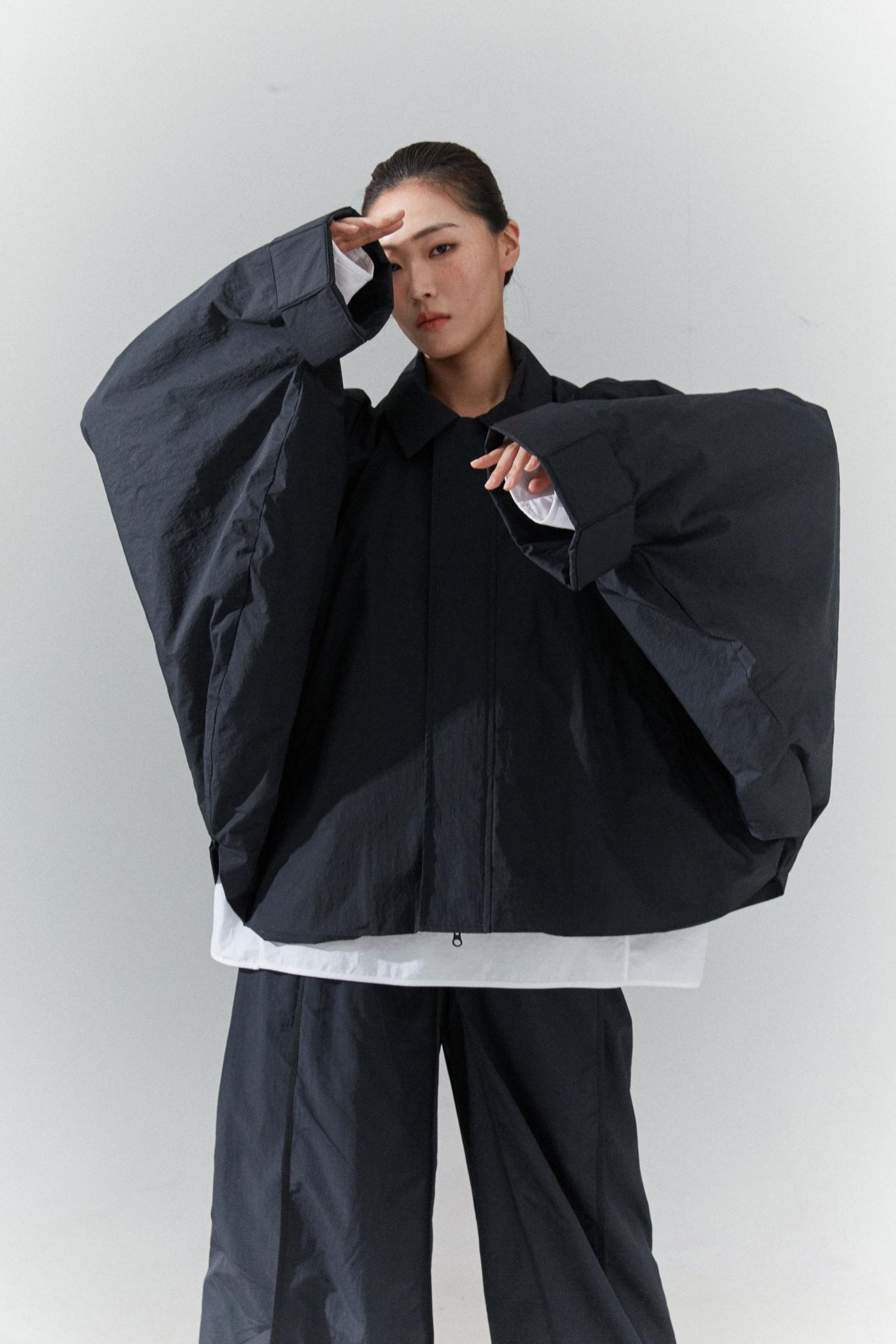 Two-way zipper on the front, pocket details on wide sleeves and body panels
