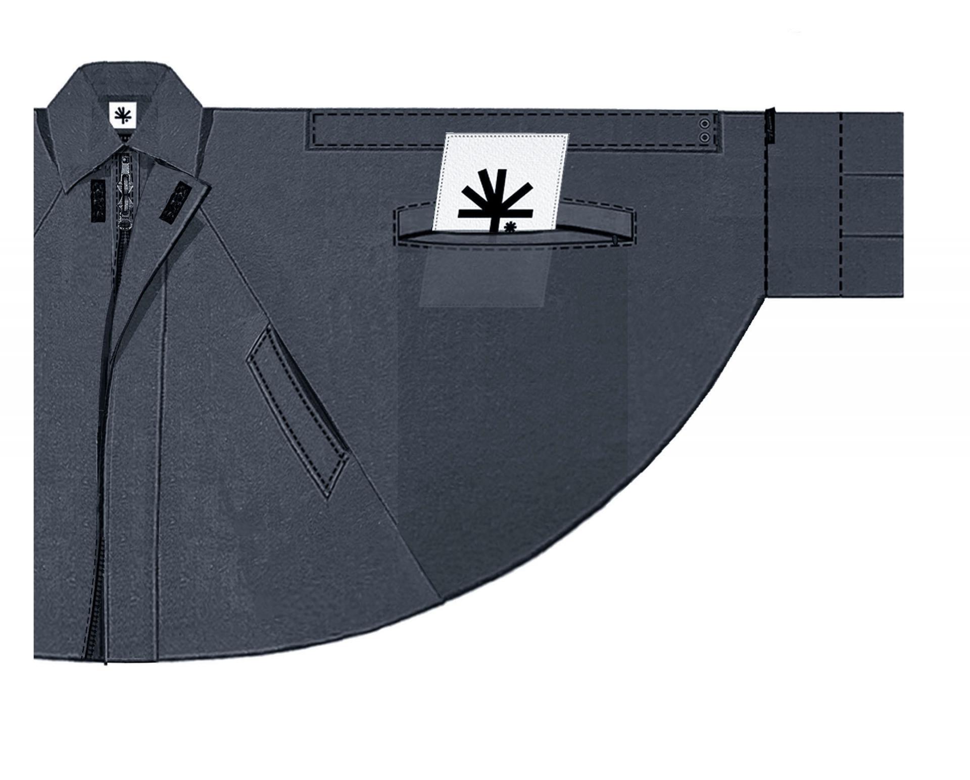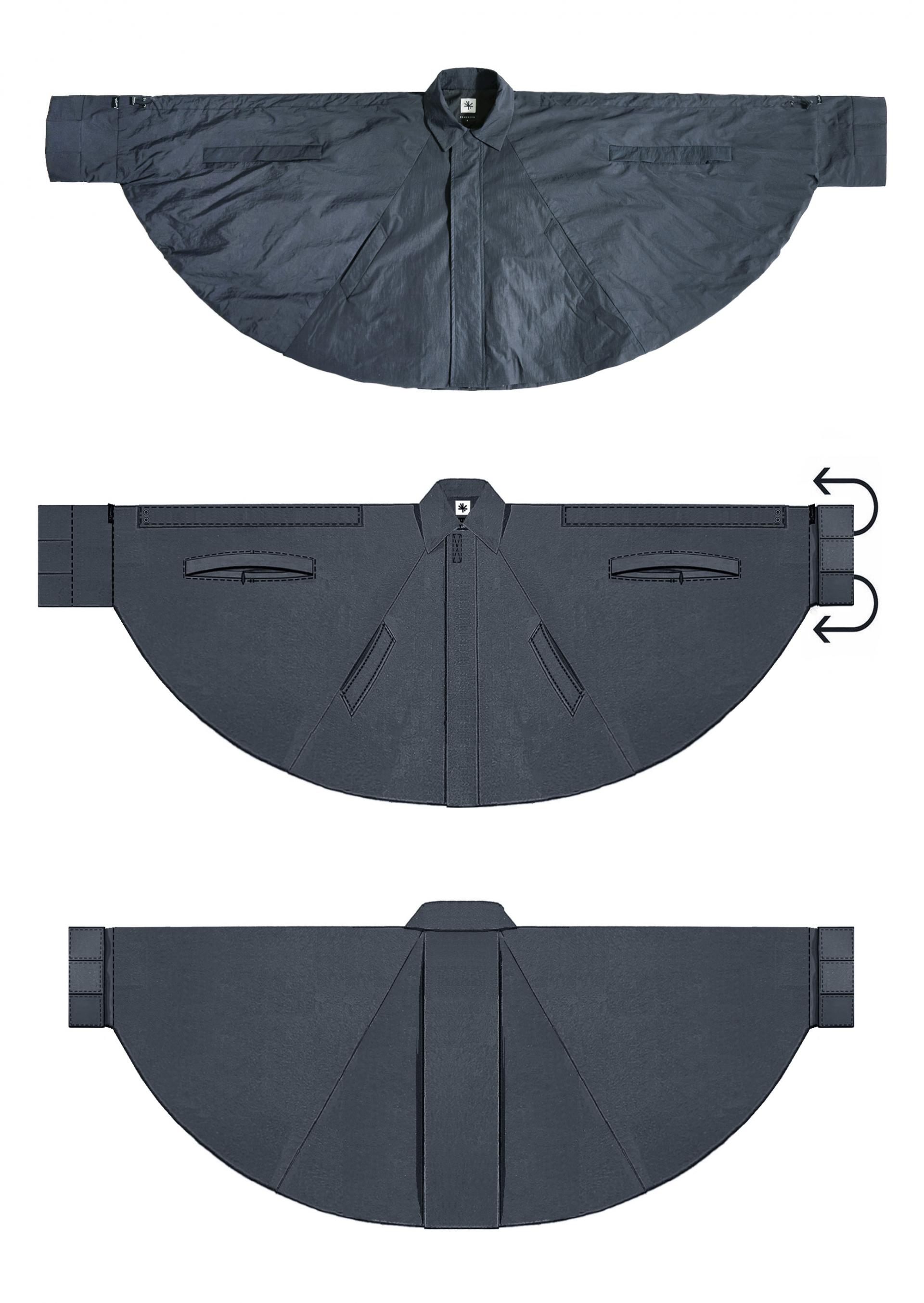 Adjustable length of sleeves by tightening the strings coming down the shoulder line and folding or unfolding the cuffs for a variety of styling