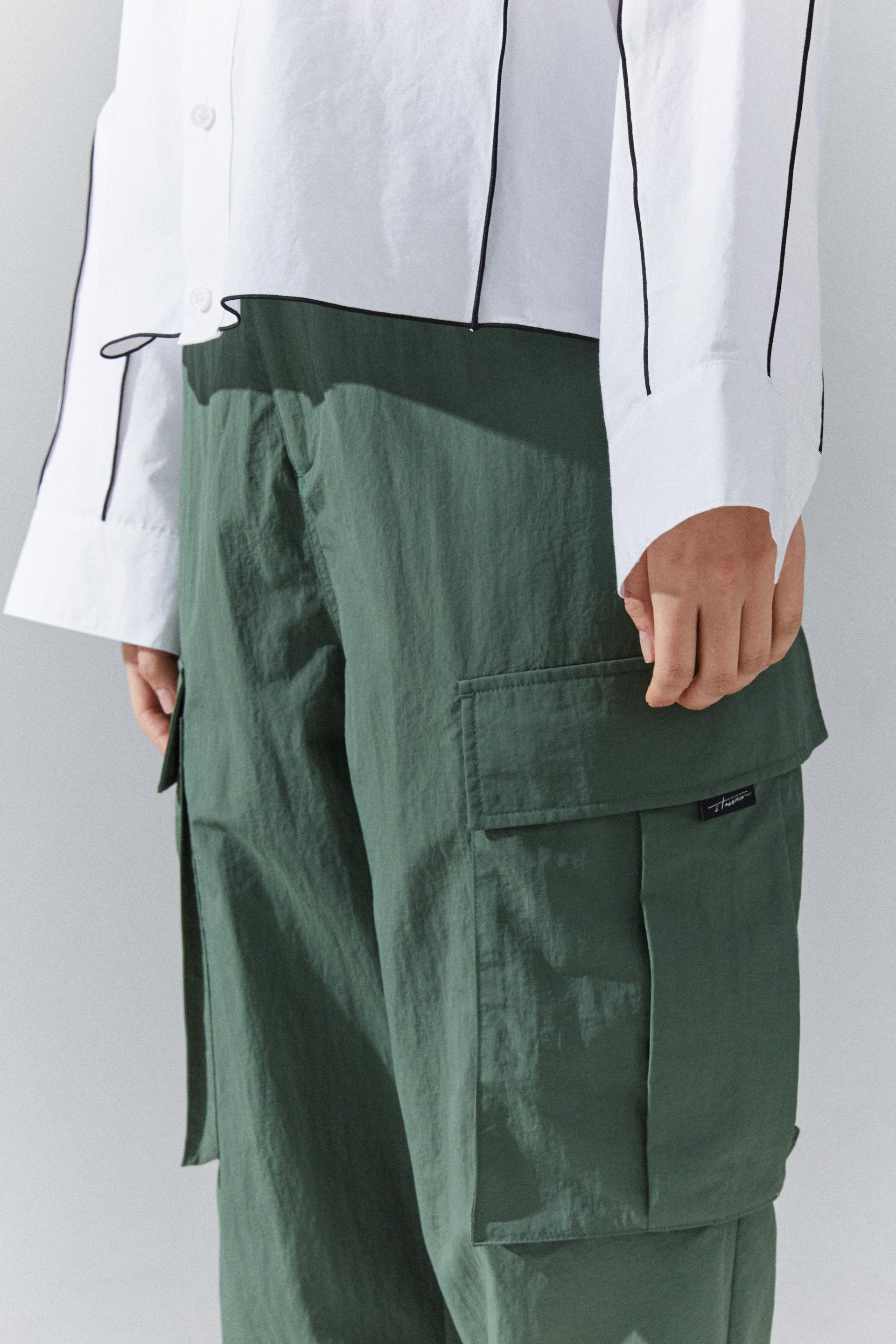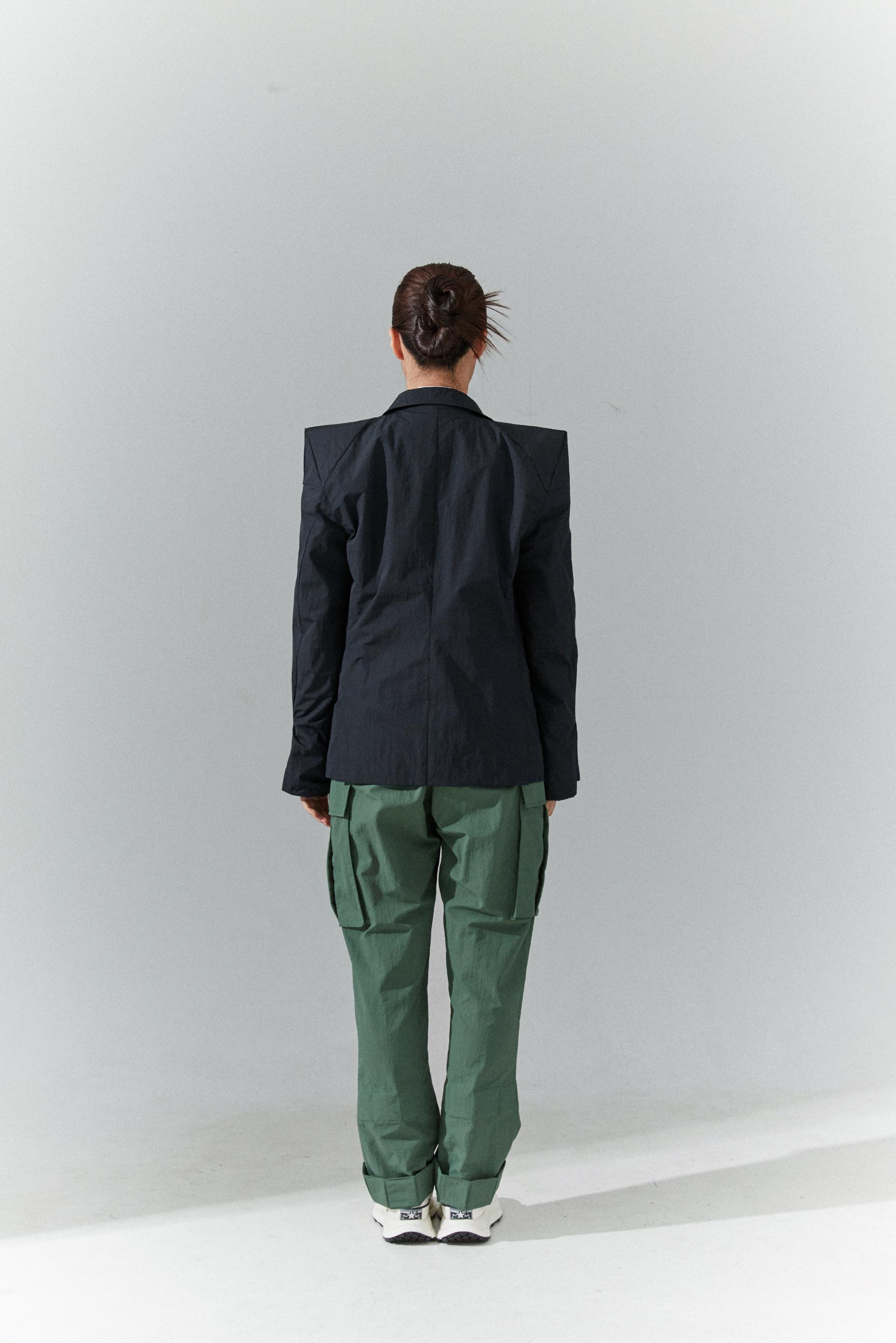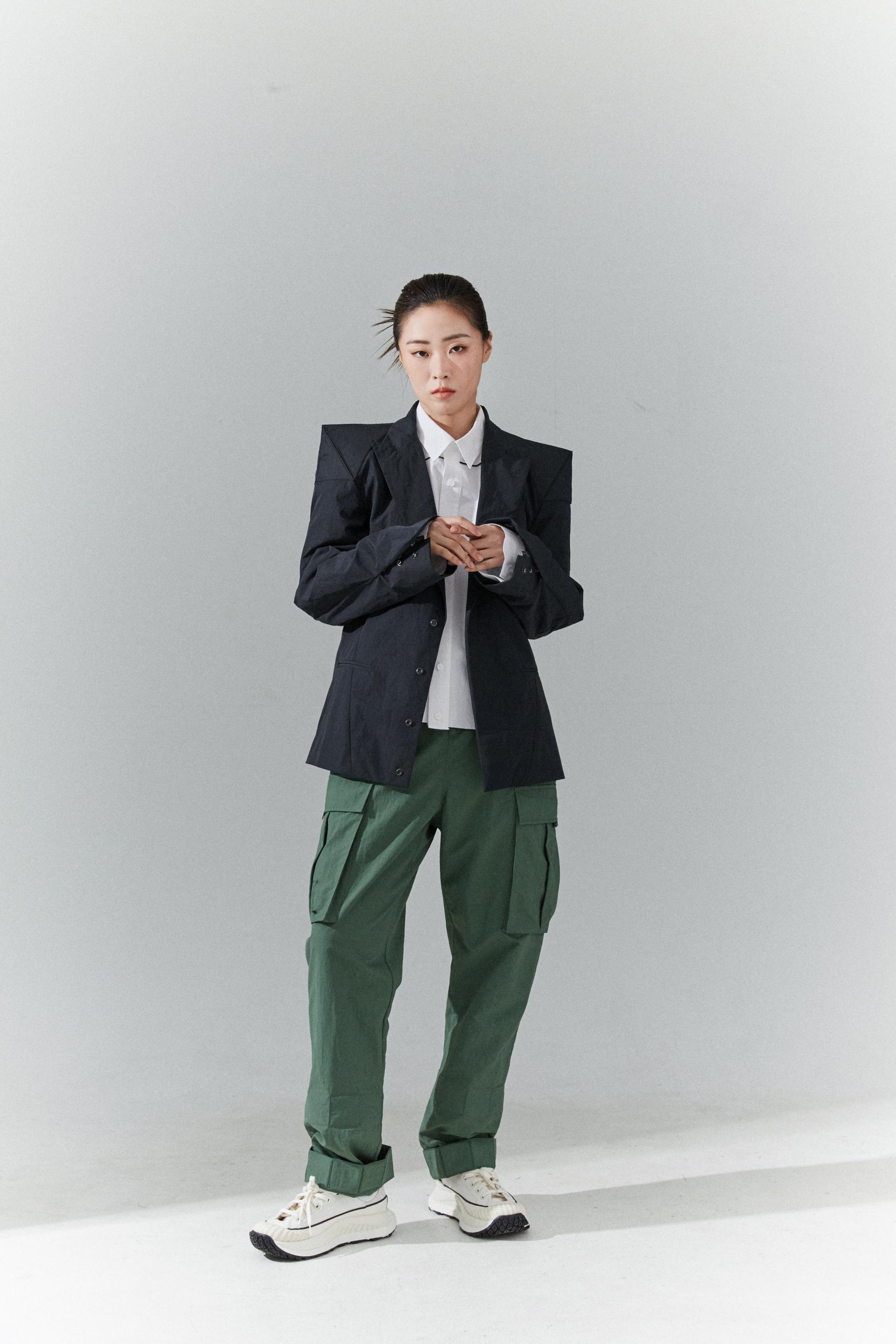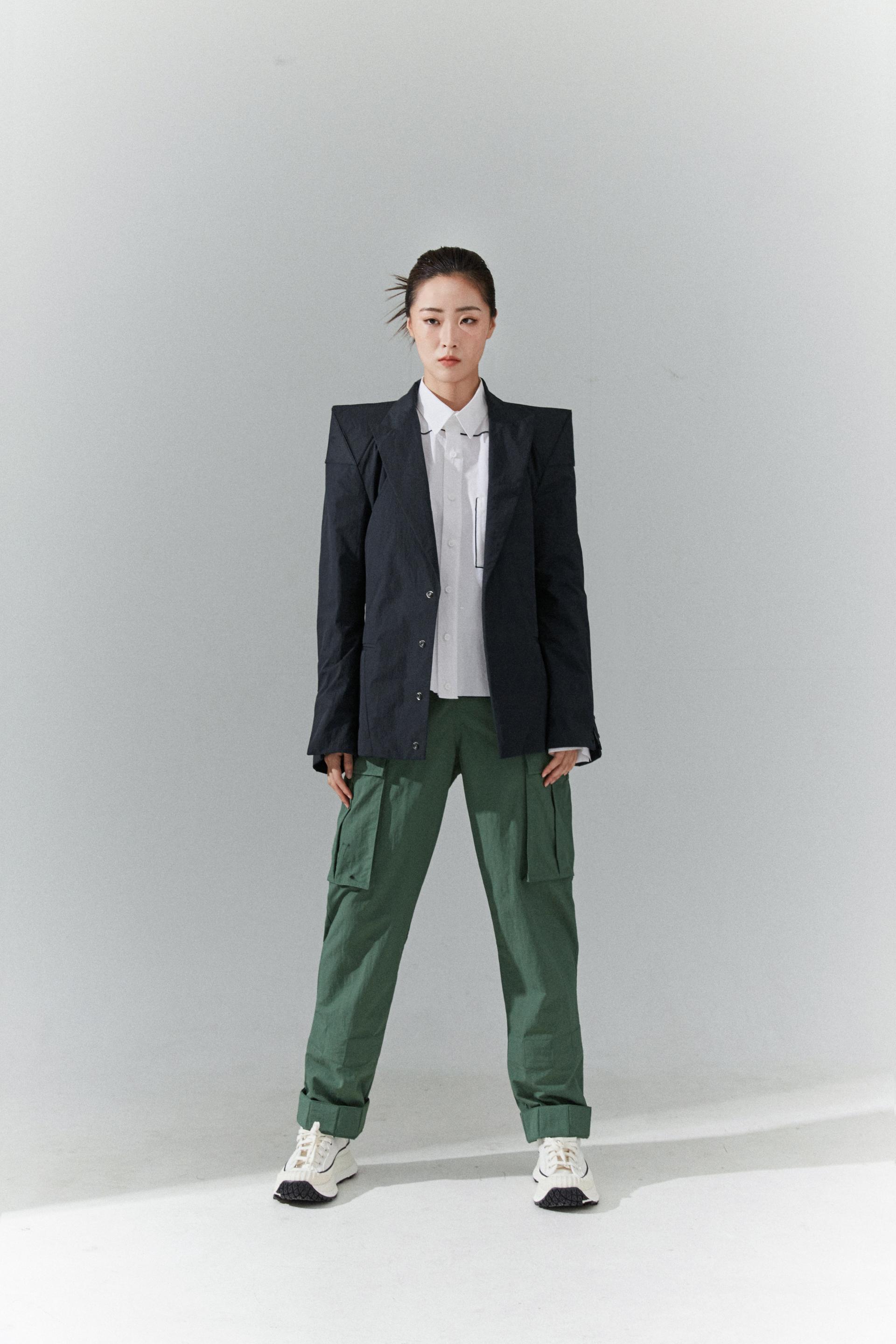 Basic cargo pant with 2-tiered octagonal prisms for structured silhouette and movement