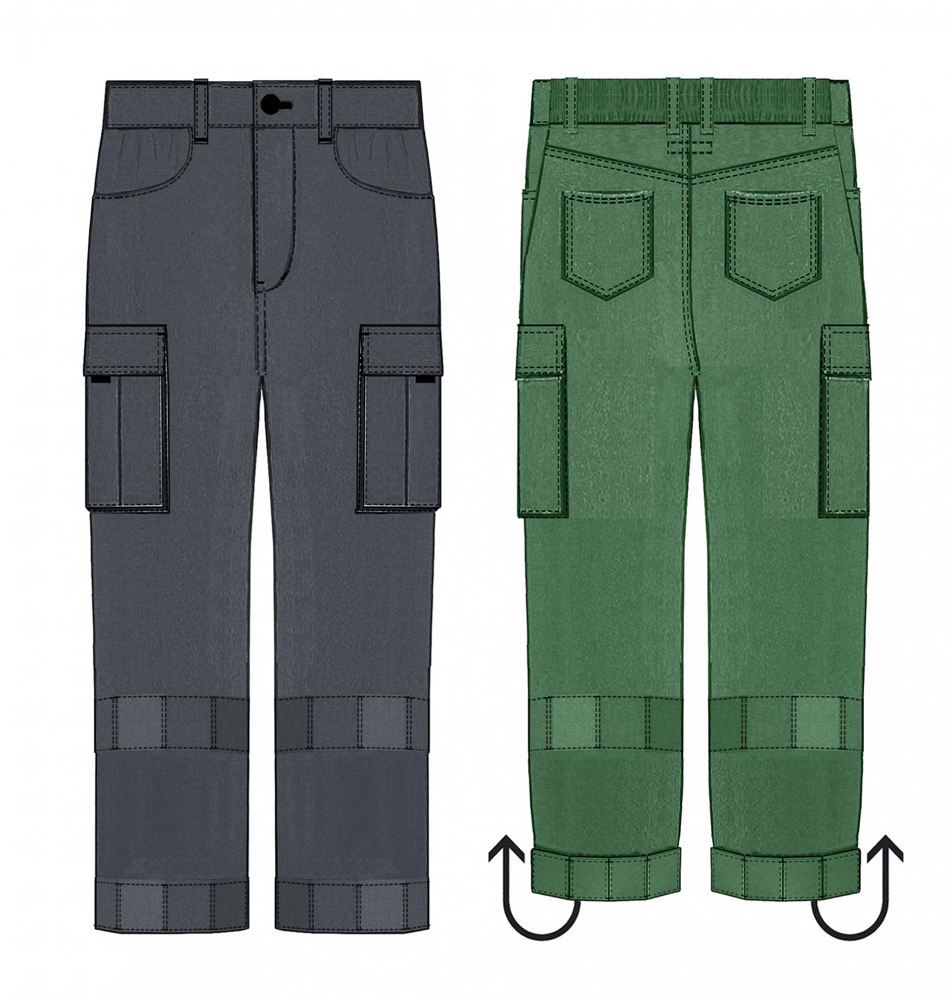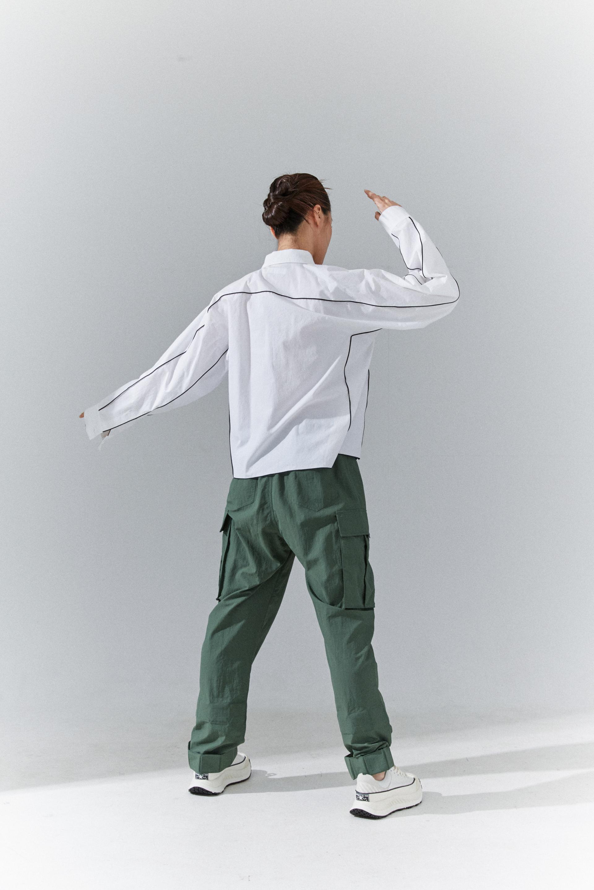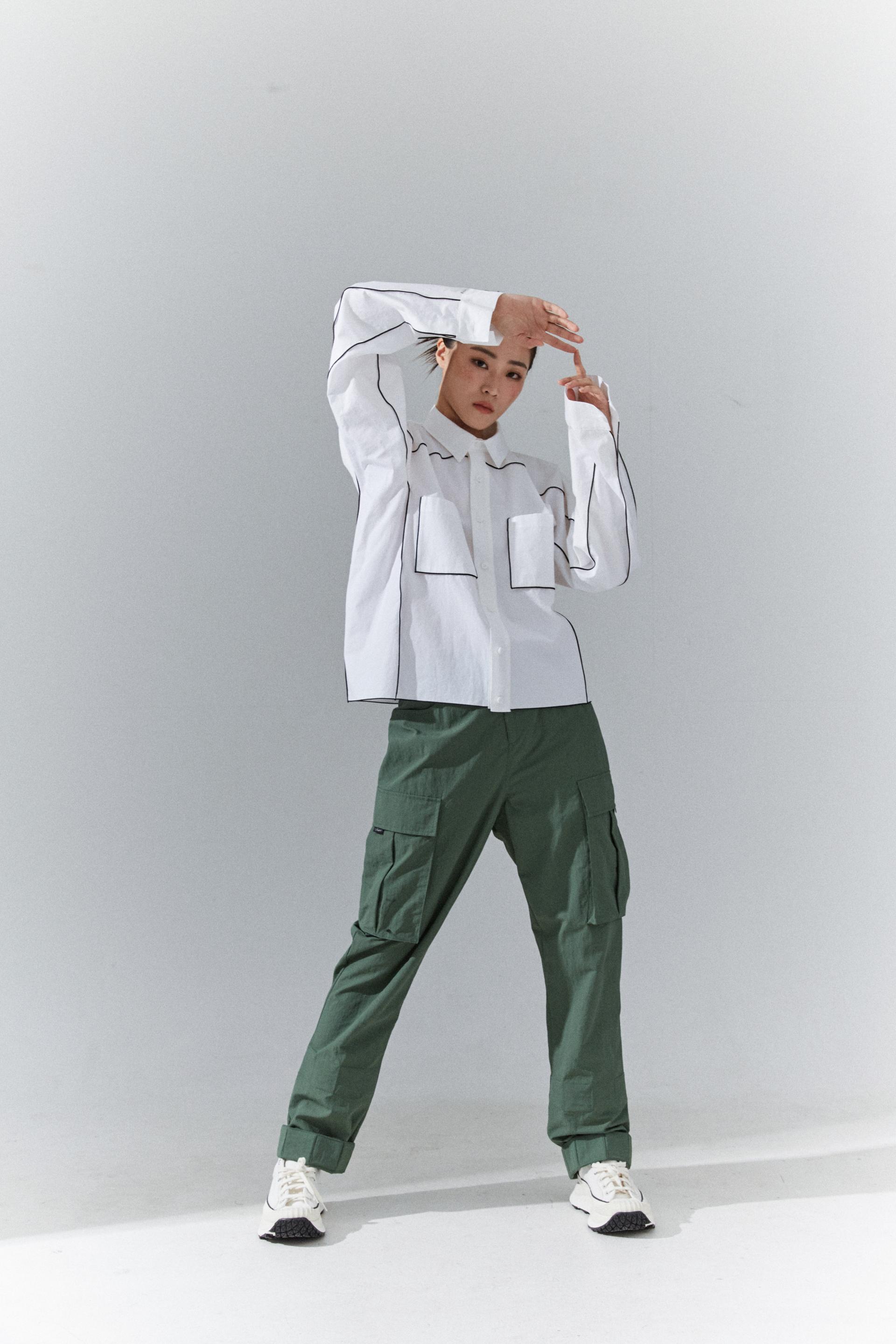 Basic cargo pant with 2-tiered octagonal prisms for structured silhouette and movement