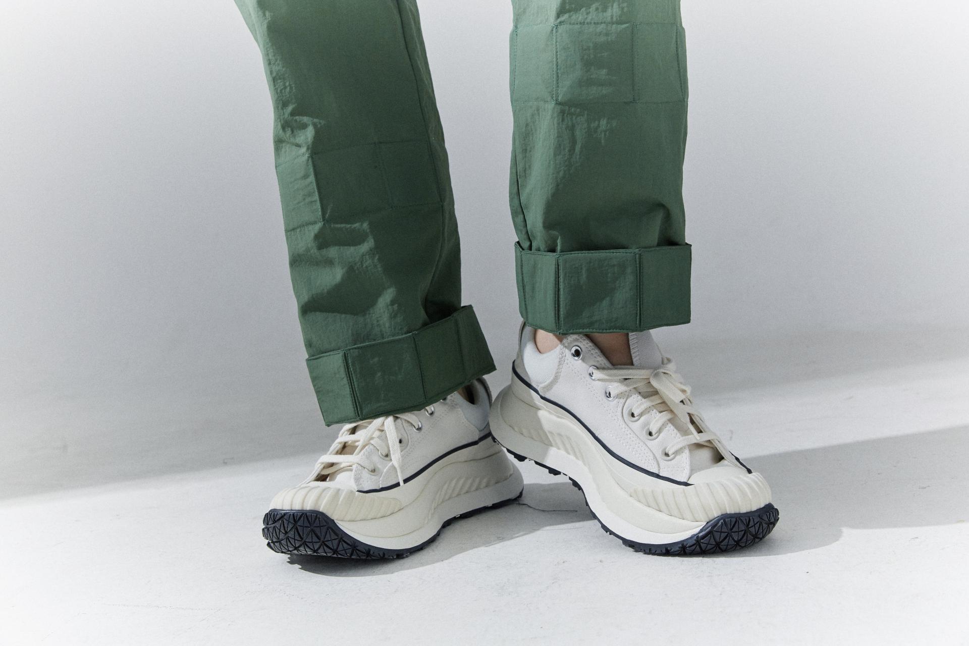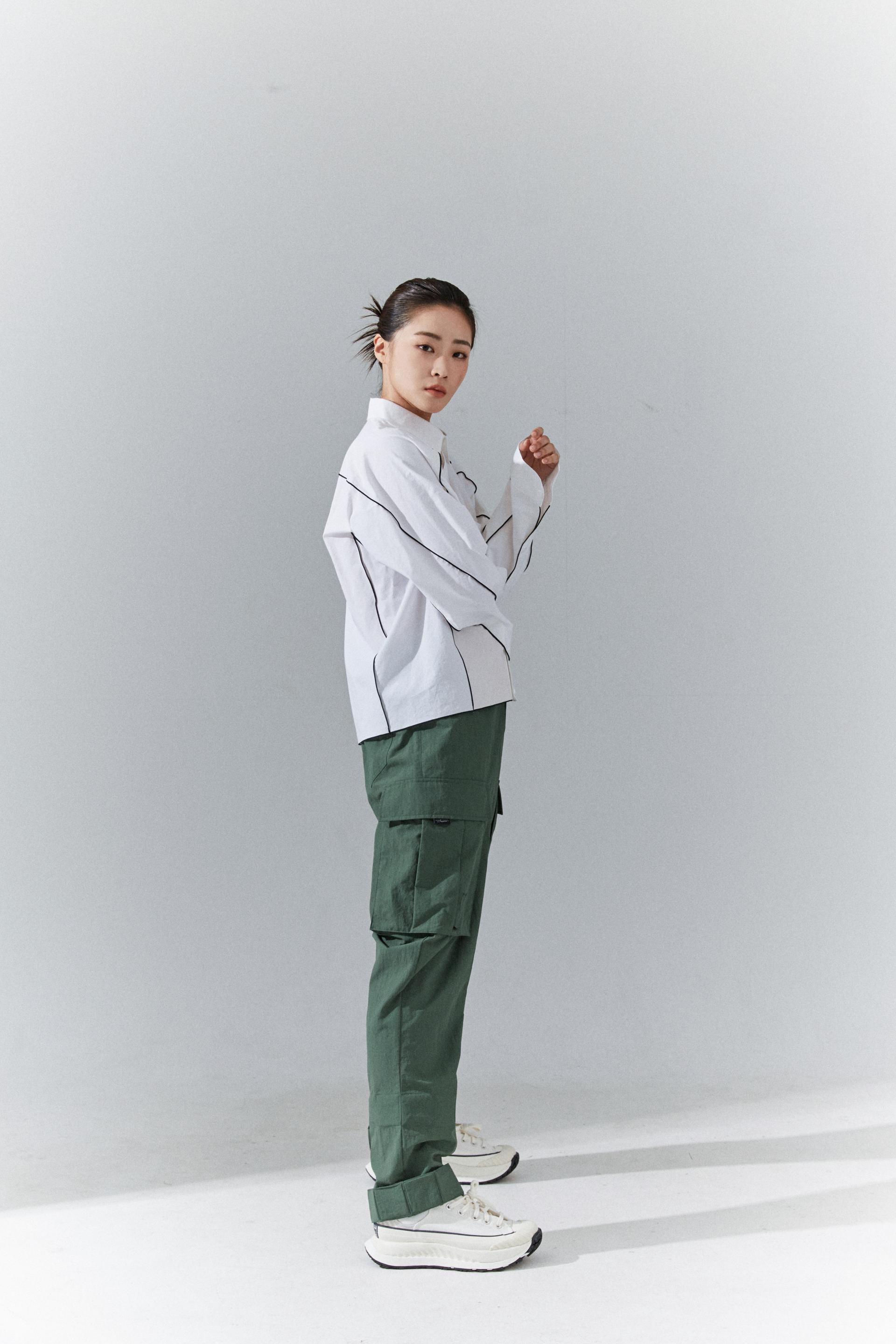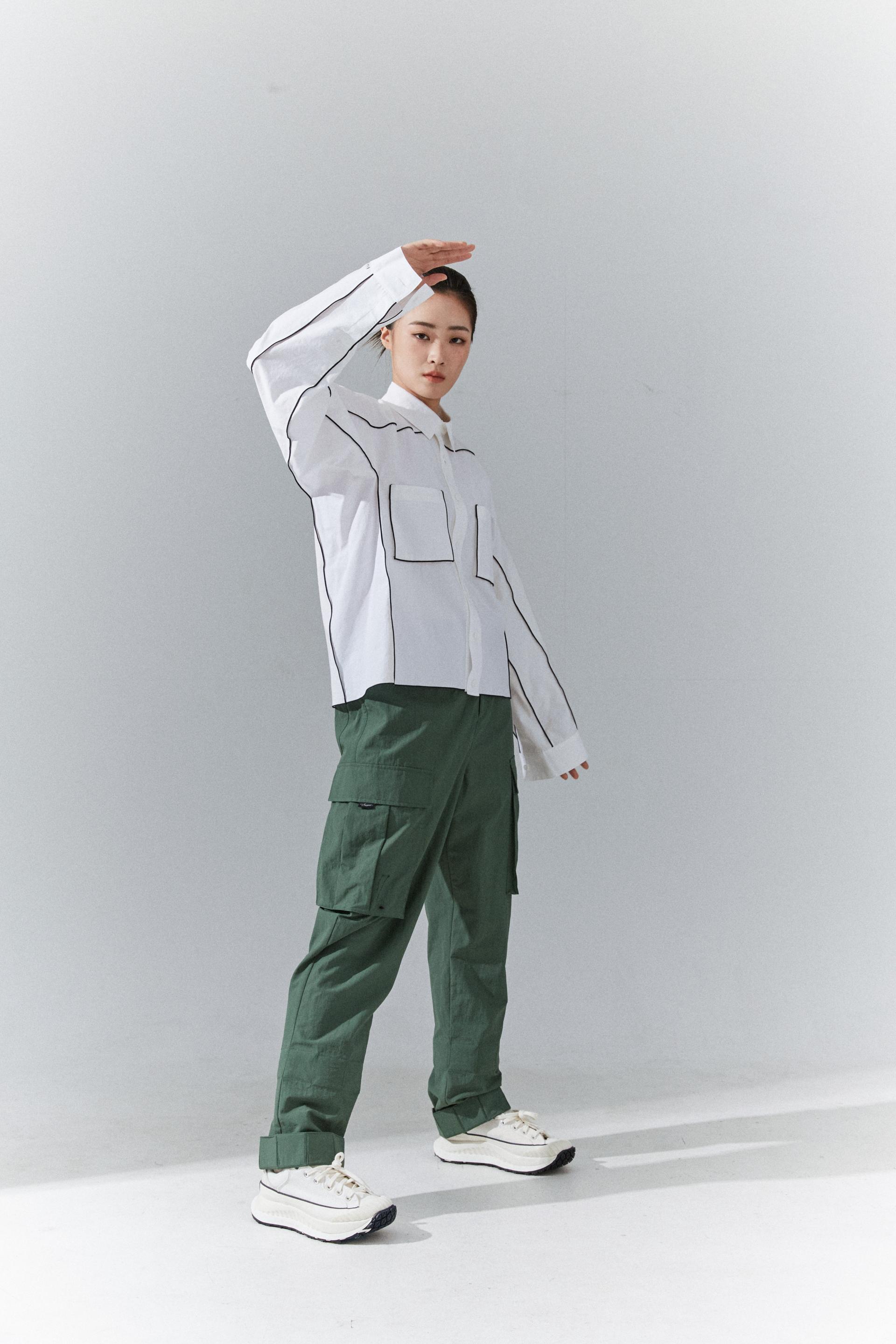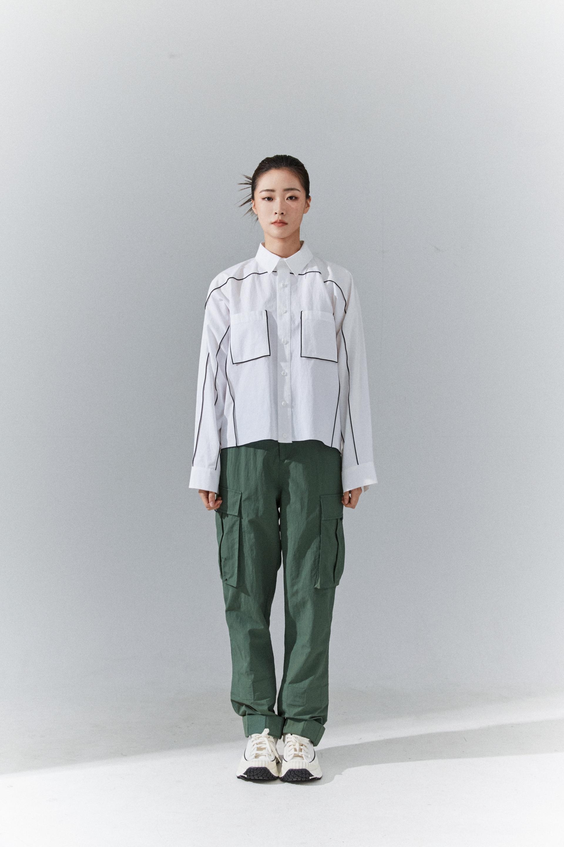 Basic cargo pant with 2-tiered octagonal prisms for structured silhouette and movement